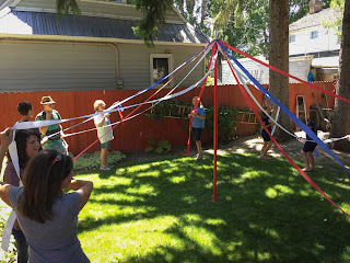 I made the trip home to Idaho so I could be there for the 4th of July. I LOVE 4th of July in Idaho Falls. We had an awesome family get together for lunch in my parents back yard. My mom is so cute! She always has these fun ideas and things for us to do. My mom and my sister planned a bunch of games for us to play like a pass the parcel type game, a price is right game, a draw a picture on a plate game... just silly fun stuff. The highlight of the day was the maypole. My mom has always wanted to wind the maypole. When she was in elementary school in Orem, UT, the 4th grade got to wind the maypole. It was something the kids really looked forward to, but sadly my mom moved before she got to wind the maypole and she's always wanted to. So my mom decided to build her own maypole this year. Both her sisters were there to help along with lots of grandkids. It was a little bit of a rough start but we kinda got it worked out by the end. It was really cute.
